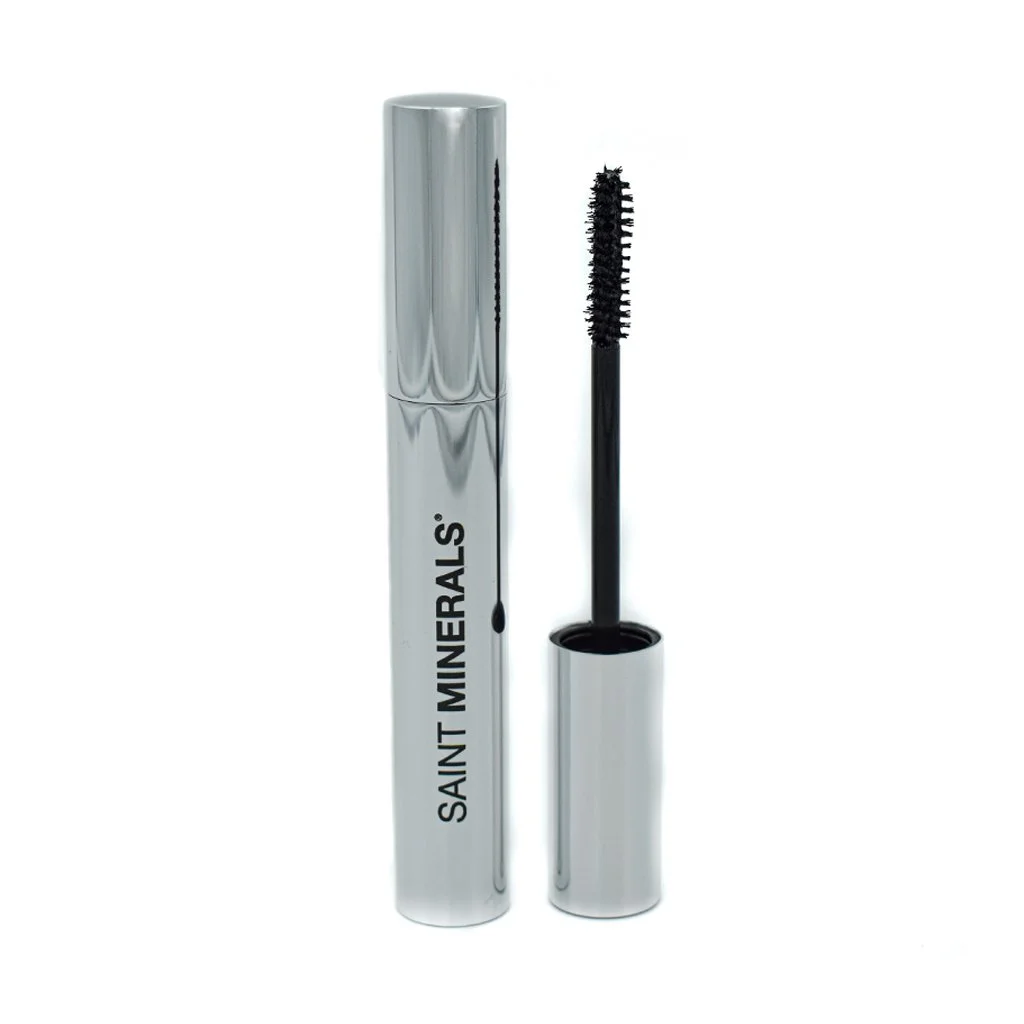 Open the mascara tube: Twist open the cap of the Saint Minerals® Lengthening Mascara tube. Gently pull out the mascara wand, making sure to scrape off any excess product on the rim of the tube.